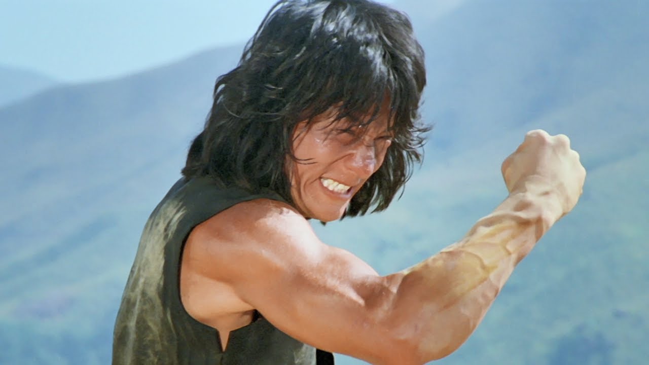 On the IMDb page of the movie, in the Photos section there is a photo with Jackie Chan holding a folding fan: