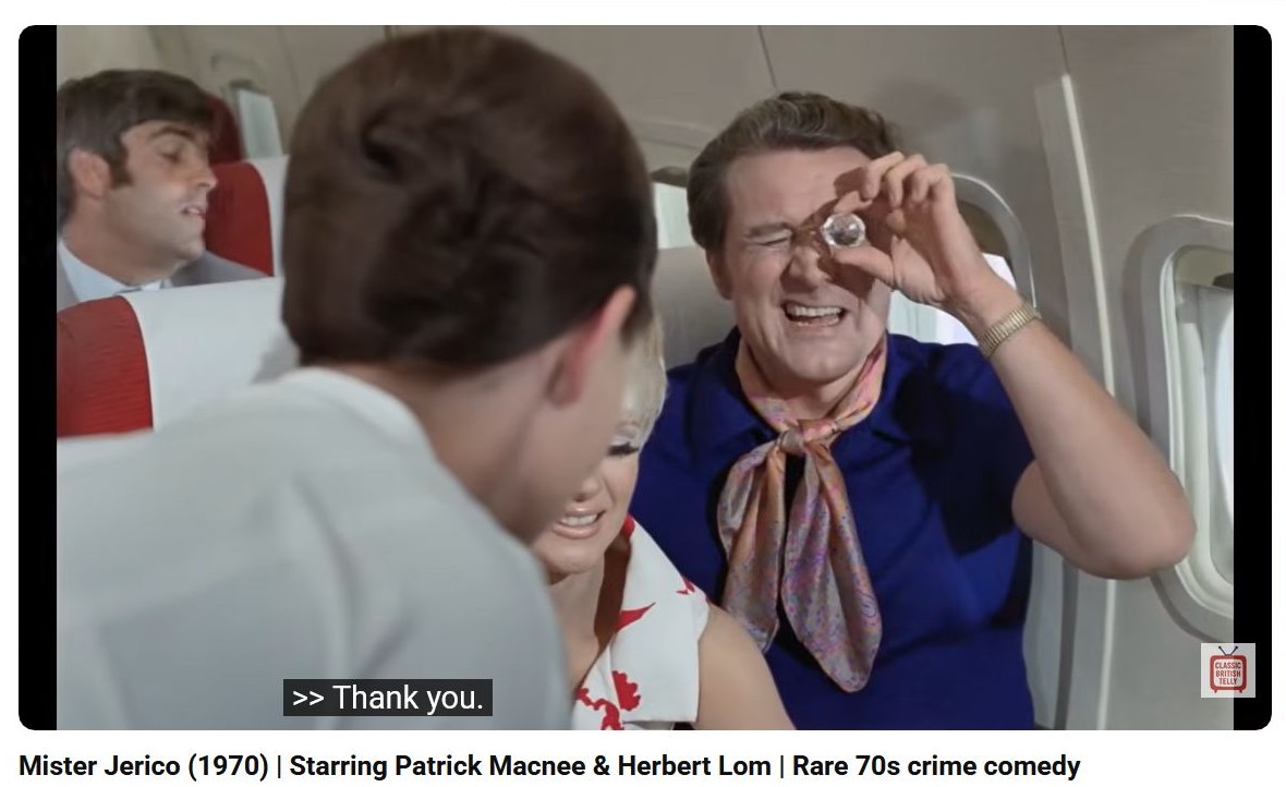 Final scene is on a plane. The male and female lead are looking at a large diamond, the female lead is placing it against different fingers to decide where best to wear it. A female flight attendant sees the diamond and the male lead tells her it is ‘paste’