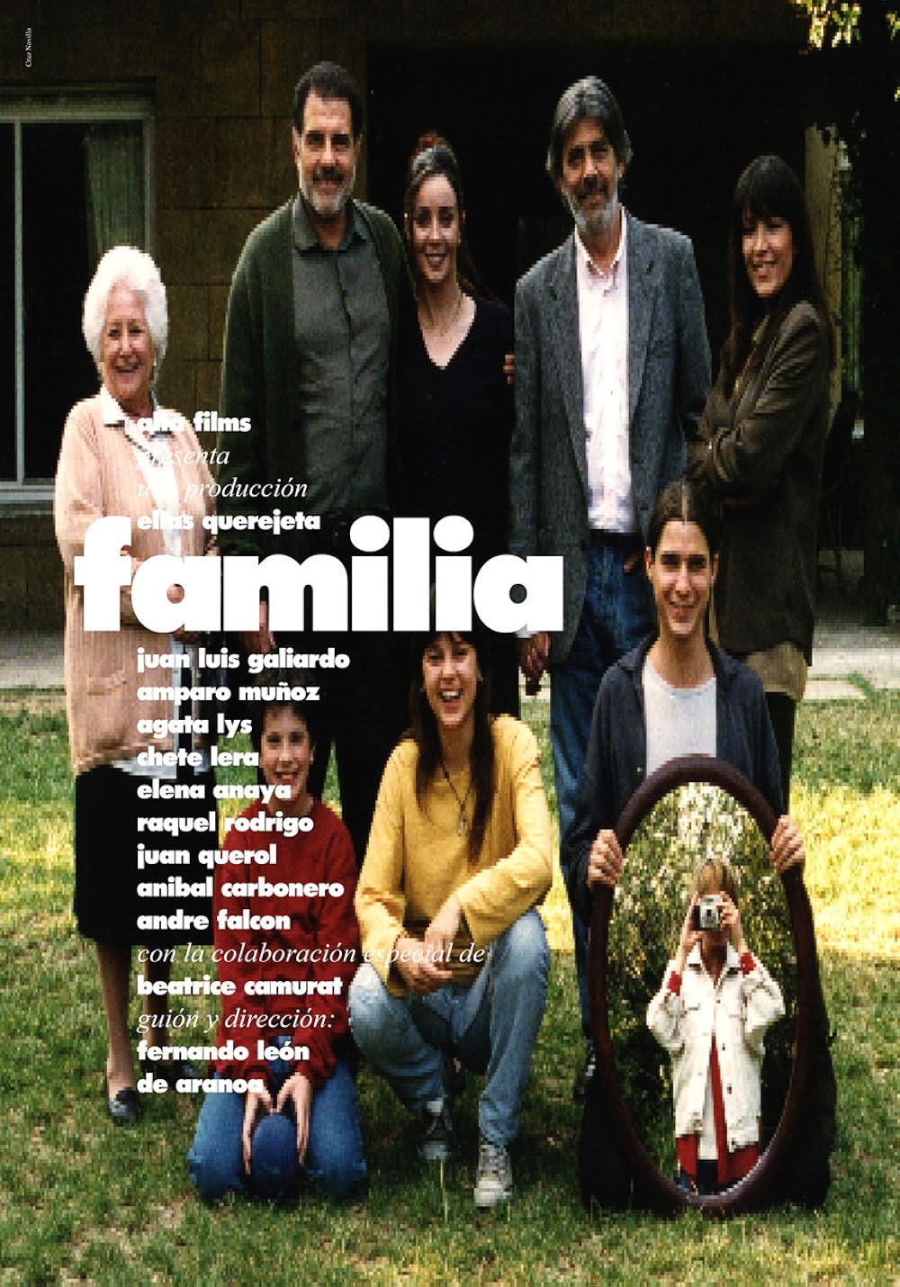 Spanish Movie between 95 to 05, actors hired as fake family members, old woman acting as granny boasting thy she can weep act whenever she likes.