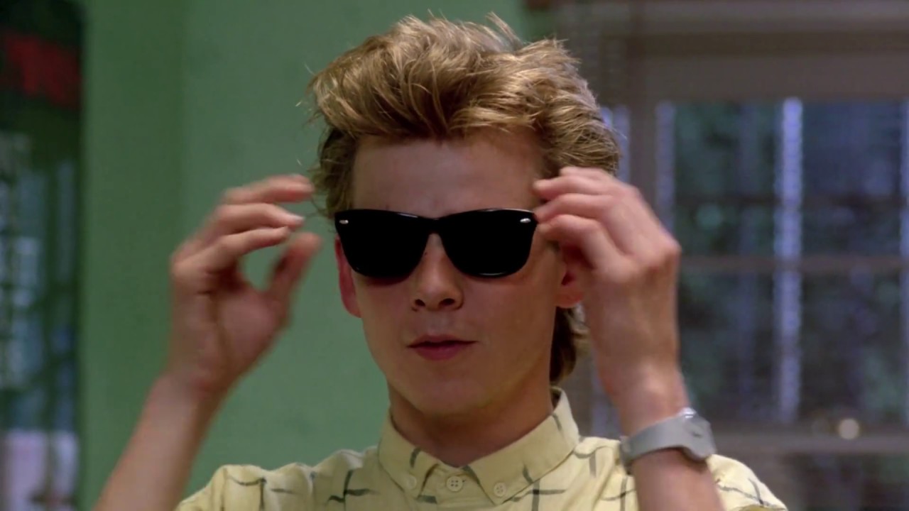 A TV or movie scene where a man rubs his legs with a stick aggressively while listening to very loud heavy metal music in his bedroom